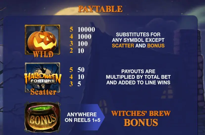 - Scatter (logo Halloween Fortune): paga 50×/10×/5× por 5/4/3 en cualquier posición. Sus pagos se multiplican por la apuesta total y se suman a las ganancias de líneas.